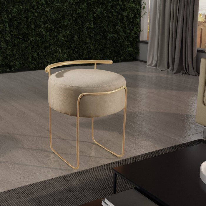 Puff Redondo com Base em Ferro Dourada e Estofado Ivar Bege