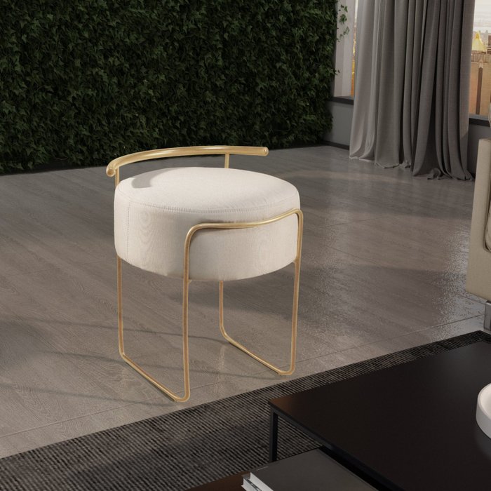 Puff Redondo com Base em Ferro Dourada e Estofado Ivar Bege Claro