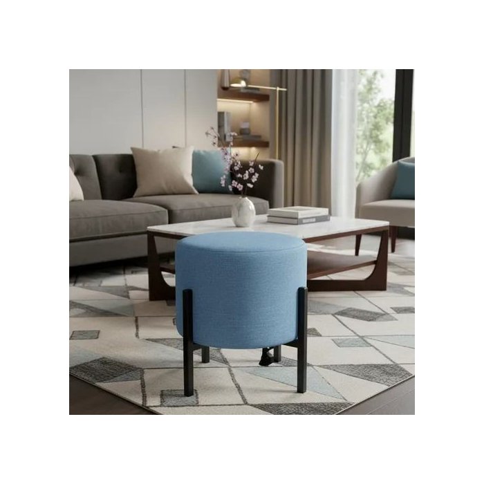 Puff Redondo com Pés de Aço, 40x40x43 Cm, Tecido Blouclé Veneza na Cor Azul
