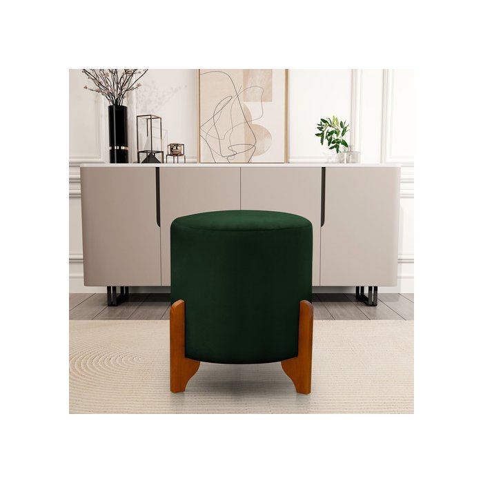 Puff Redondo em Veludo com Pés em Madeira Maciça Decorativo Sala Quarto - Verde Escuro