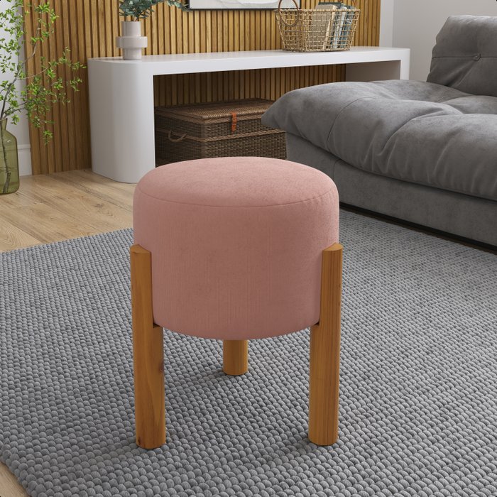 Puff Redondo Estofado Suede Rose com Pés em Madeira Banqueta Elegante