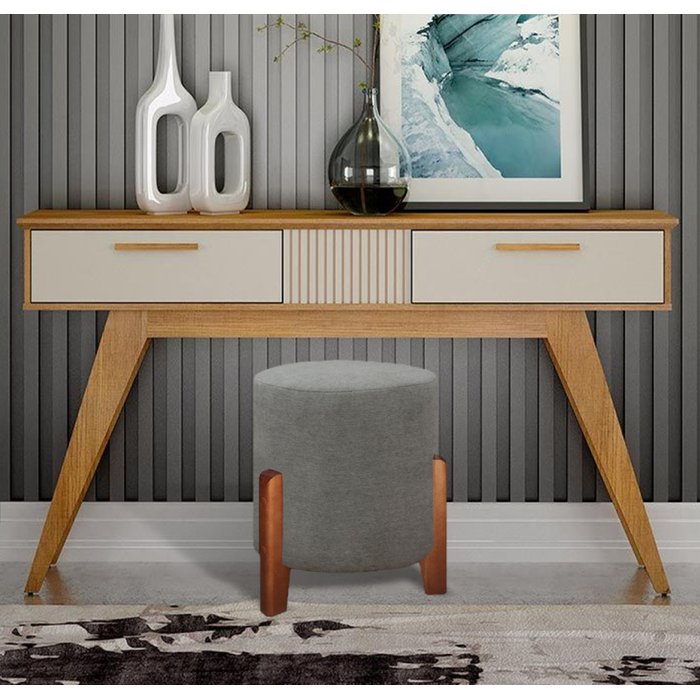 Puff Redondo Luxo Pés em Madeira Luna Linho Cinza