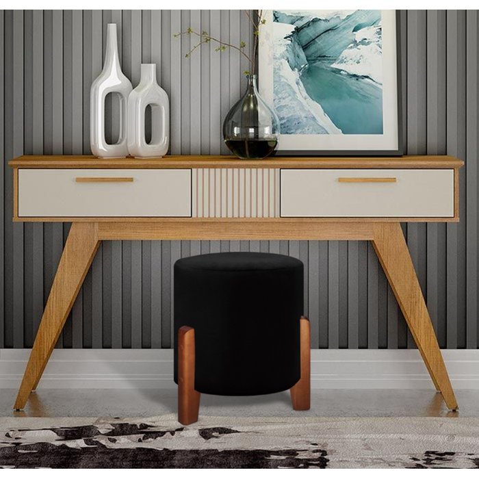 Puff Redondo Luxo Pés em Madeira Luna Veludo Moderno Conforto Penteadeira Cor Preto