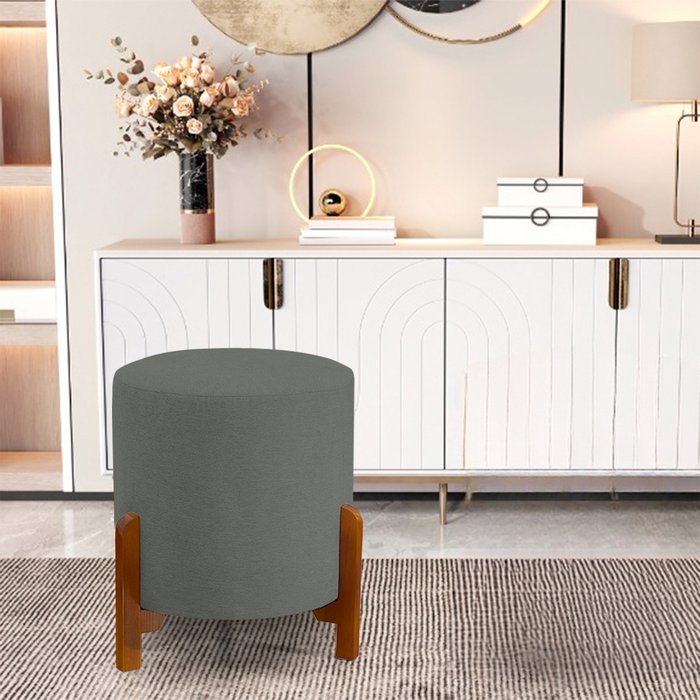 Puff Thor 3 Pés Linho Cinza Base em Madeira Maciça