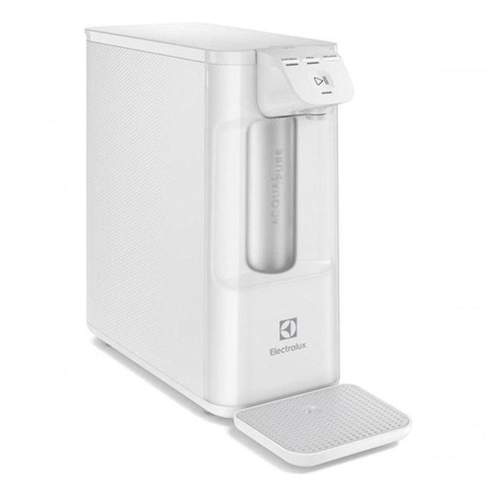Purificador De água Electrolux Pure 4x Pe12b Branco Bivolt Voltagem:bivolt O Purificador de água Pure 4x possui tecnologia Powerjet, que enche seu copo até 4x mais rápido. Esse modelo possui Tecnologia Acqua Pure: reduz cloro, odores e outras partículas presentes na sua água*. Além disso, é eficaz no controle do nível microbiológico* da sua água. Com design compacto e inovador, esse Purificador de água Electrolux é ideal para casas compactas, pode ser instalado em bancadas e possui 4 cores diferentes para modernizar o ambiente. O painel touch possui iluminação de LED para sinalizar a saturação do filtro e facilitar a escolha de uma das três temperaturas de água: natural, fresca ou gelada. A troca de refil é fácil e simples, a cada 3.000 litros ou 6 meses de uso. O alerta de troca de filtro sinaliza a hora certa de substituir. O purificador também conta com bandeja removível e pés de borracha antiderrapante, facilitando a limpeza sem comprometer a estabilidade e boa performance. * Testado de acordo com a Portaria 394/2014 e ABNT NBR 16098:2012. ** Testado com a bactéria Pseudomonas aeruginosa conforme ABNT NBR16098:2012