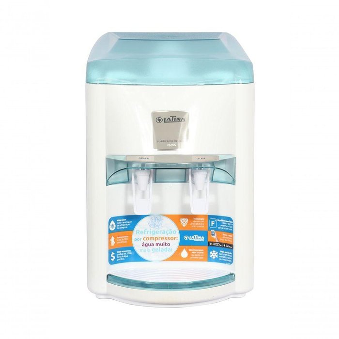 Purificador De Água Latina PA355 Com Sistema De Refrigeração Por Compressor Branco Com Verde 127VO PA355 da Latina é um purificador de água com sistema de refrigeração por compressor que oferece alta capacidade para fornecimento de água gelada. Certificado pelo Inmetro, com eficiência comprovada em eliminação de impurezas e remoção de cloro, esse purificador pode ser utilizado tanto em ambiente doméstico quanto corporativo. O PA355 tem controle manual de temperatura que possibilita maior eficiência energética, duas torneiras e bandeja removível. O filtro de reposição do purificador de água PA355 é bacteriostático e impede a proliferação de bactérias e outros micro-organismos. Esse filtro é ecológico, seu carvão ativado é gerado a partir do endocarpo do coco de babaçu, além de ser muito fácil de trocar.Este produto foi projetado para ser utilizado com água pré-tratada permanentemente clorada. A pressão da rede deve ser inferior a 392,3 kPa (4 kgf/cm2 ) e superior a 39,2 kPa (0,4 kgf cm2 ), sendo que, para pressões maiores ou locais onde haja elevação brusca de pressão é recomendada a utilização de uma válvula reguladora de pressão (acessório) que pode ser encontrada na Rede de Assistência Técnica Latinatec. Este purificador de água está disponível nas cores Branco e Fumê, Branco e Verde, Prata ou Preto.