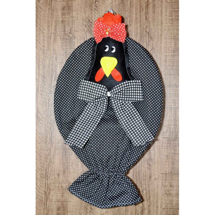 Puxa saco confeccionado em tecido 100% algodão, no formato de galinha nas cores preta, amarelo, tecido preto com bolinhas branca e tecido estampado de flores na cor branco e vermelho e um lindo laço na cor xadrez preto.
