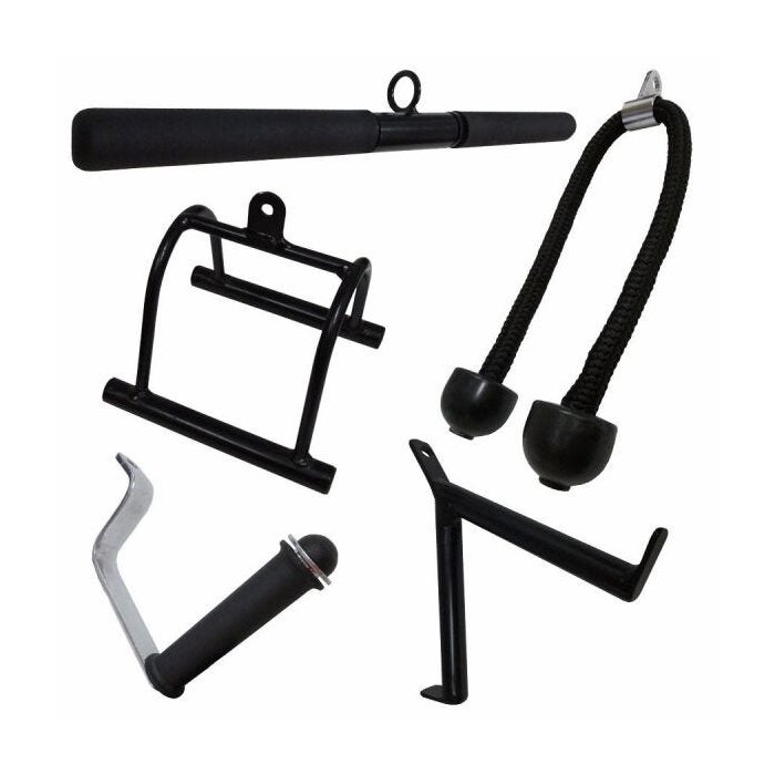 Puxadores reforçados para um treino mais ou menos intenso, peças com garantia e que não soltam ou descascam devido ao seu tratamento com pintura epoxi em alta temperatura, soldas reforçadas e excelente acabamento, produto de primeira linha e nacional. 01 - Puxador Reto com Giro 50 cm 01 - Puxador Estribo Aberto 01 - Puxador V 01 - Puxador Triângulo 01 – Puxador Corda