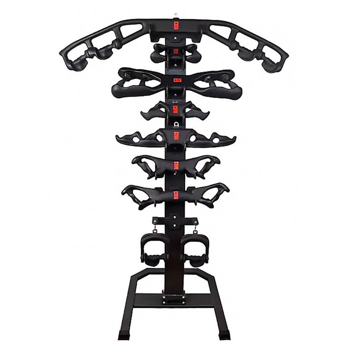 Acompanha também um suporte para que você possa guardar seus puxadores, quando não tiver usando, para garanti a organização no seu ambiente de treino. 5 Dos puxadores também já vão com mosquetão, prontos para instalar nos aparelhos.