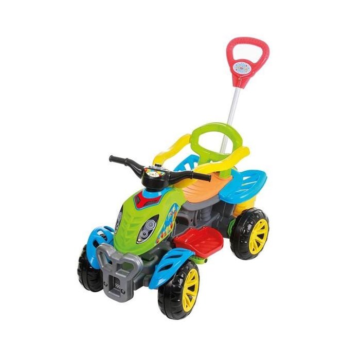 Além do aro protetor e apoio de pés, o Quadriciclo tem rodas com borracha para não derrapar, buzina e bagageiro! A haste de empurrar tem gancho para bolsa, e o adulto tem total controle da direção do brinquedo através da própria alça.