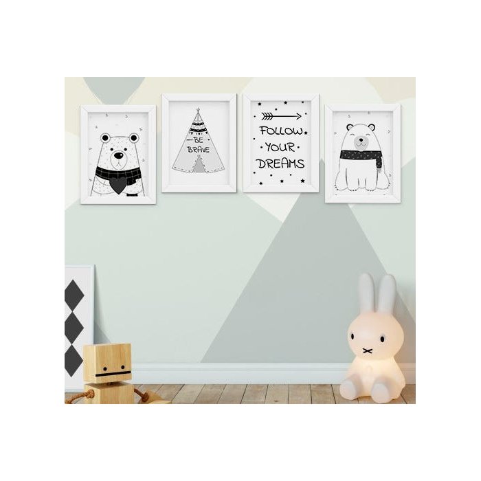 Quadro Infantil Escandinavo Ursos é uma opção super moderna nas cores preto e branco. Ideal para quem busca uma decoração minimalista dando um toque atual ao quarto dos pequenos.Detalhes do Produto