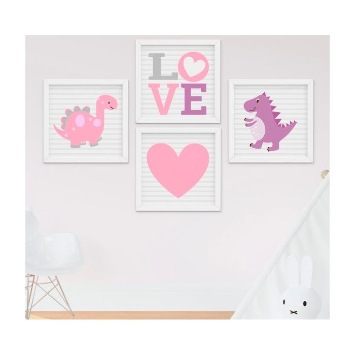 Kit Quadro Infantil Menina Dinossauro 4 Peças;Quadro Bebê Menina com moldura branca medindo 23cm x 23cm;