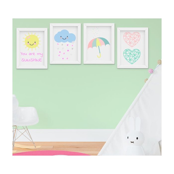 Quadrinho Infantil Quarto Bebê Menina Chuva de Amor Kit 4 Peças Quadro Infantil Bebê Moldura Cor Branca