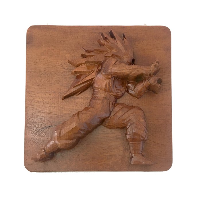 O Quadro 3D com a arte de Son Goku, protagonista da franquia Dragon Ball podemos produzir em Maracatiara, Jatobá (como na foto), Ipê, Garapeira e Itaúba, todas as madeiras são de primeira linha, maciça e sem emendas.