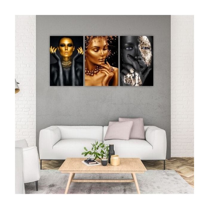QUADRO 60X40CM 3PÇS MULHERES MAQUIAGEM DOURADA LO