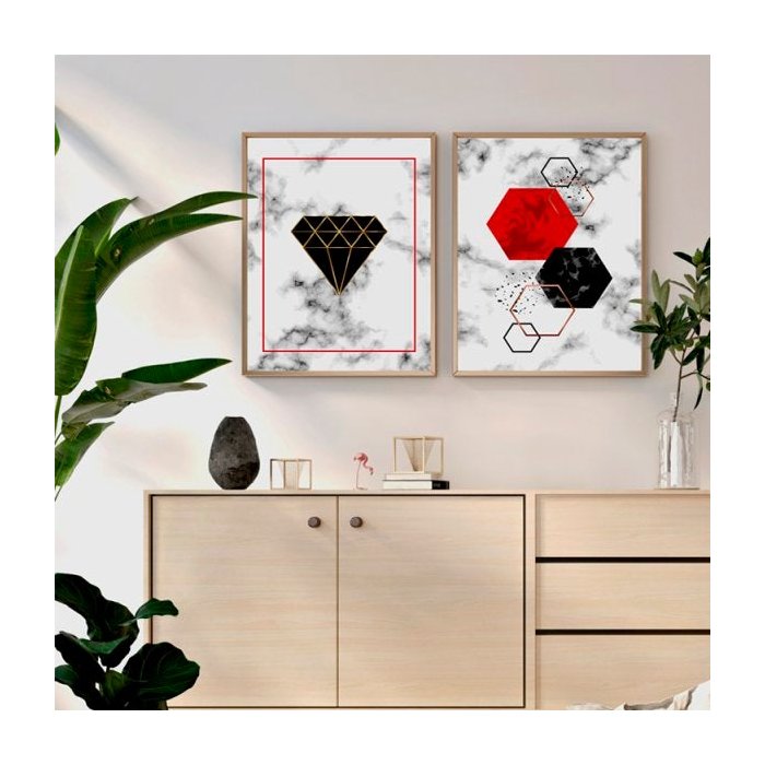 Quadro Abstrato Geométrico Vermelho e Preto Formas - Kit 2 telas - 90 x 60 cm - Branca