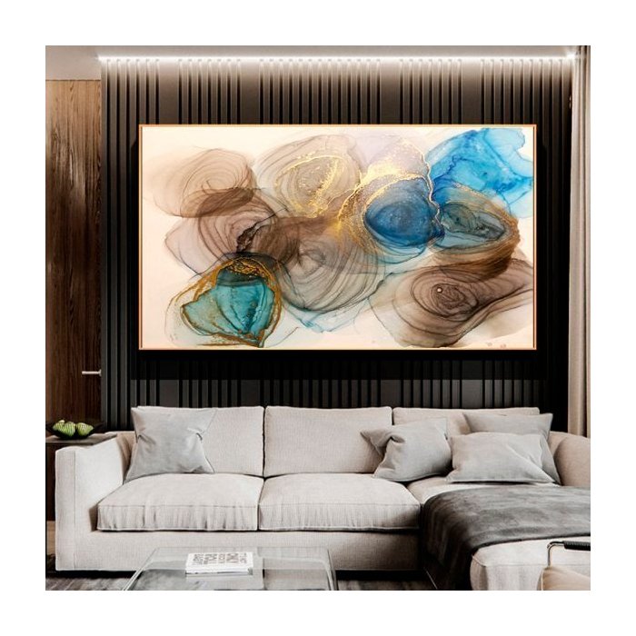 Quadro Abstrato Marrom Dourado e Azul Luxo - Tela Única - 200 x 120 cm - Chassi