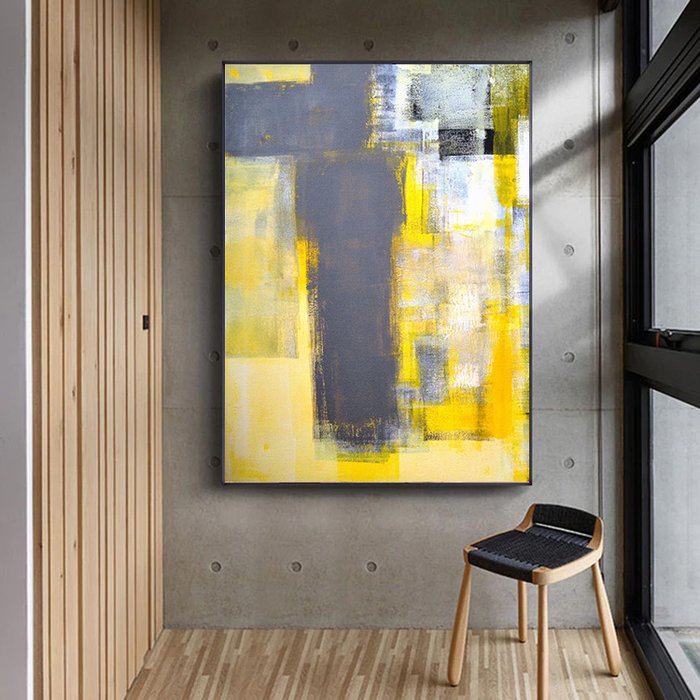 Quadro Abstrato Moderno Amarelo e Cinza Vertical - Tela Única - 120 x 90 cm - Branca