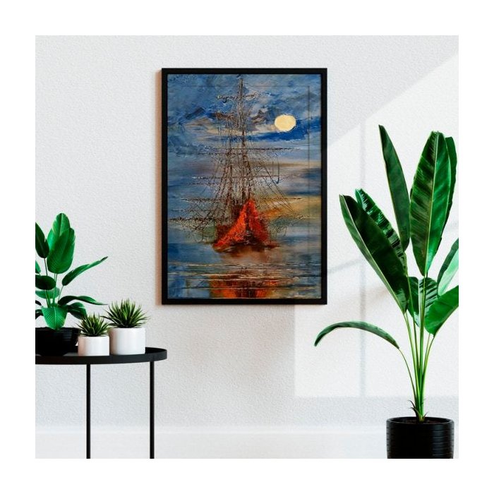 Quadro Abstrato Pintura Barco Caravela Azul - Tela Única - 90 x 60 cm - Preta