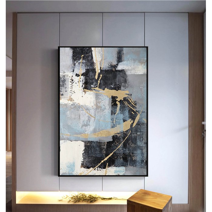 Quadro Abstrato Preto, Dourado e Tons de Azul, ideal para compor uma parede de destaque na sua sala de estar, quarto ou escritório.