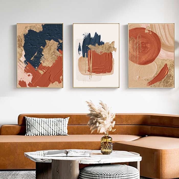Quadro Abstrato Terracota Tons Azul - Kit 3 telas - 120 x 90 cm - Dourada