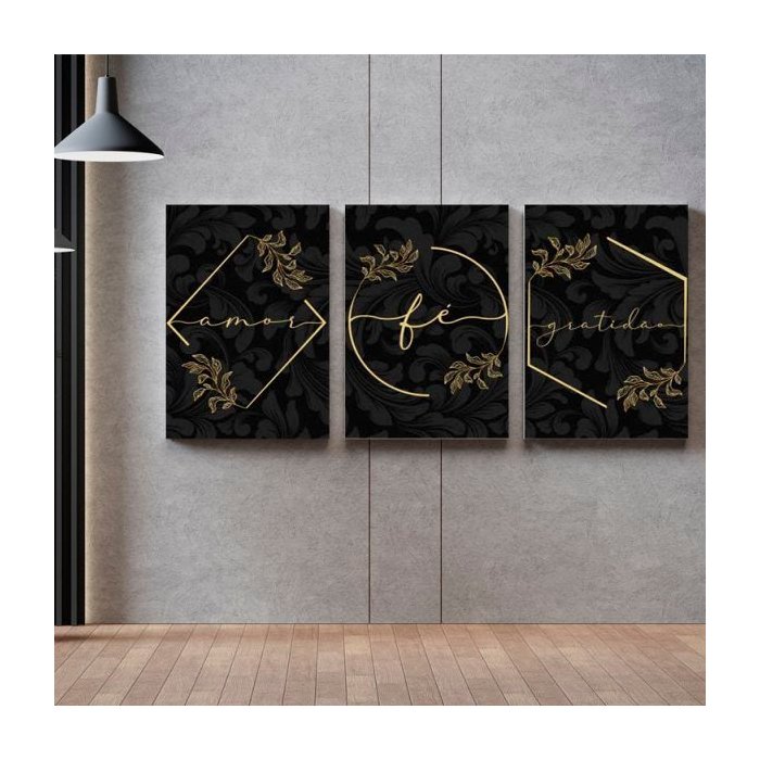 Quadro Amor Fé e Gratidão Black and Gold - Kit 3 telas - 60 x 40 cm - Chassi