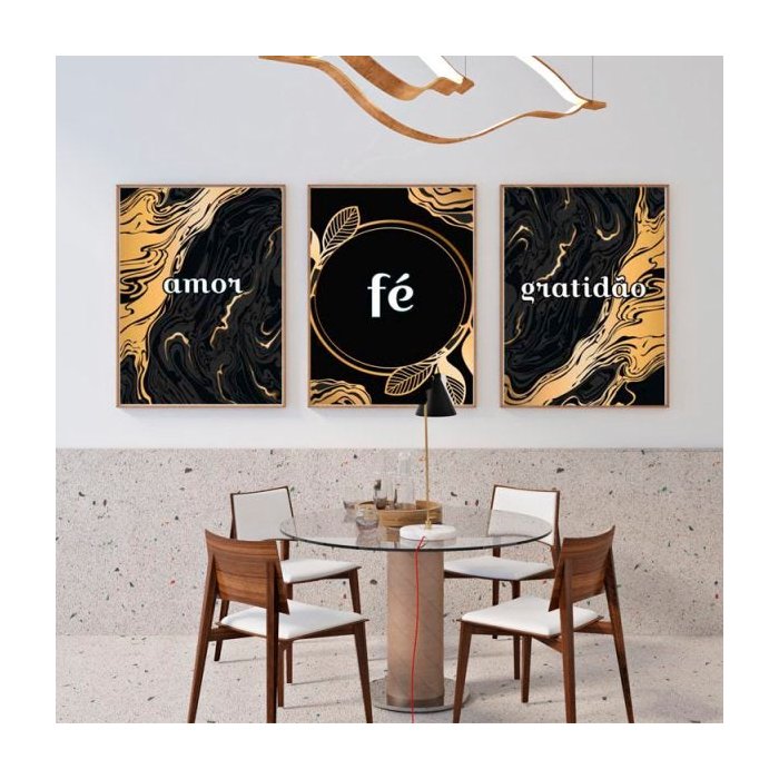 Quadro Amor Fé e Gratidão Preto e Dourado Abstrato - Kit 3 telas - 150 x 100 cm - Branca