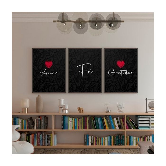Quadro Amor Fé e Gratidão Preto - Kit 3 telas - 60 x 40 cm - Branca