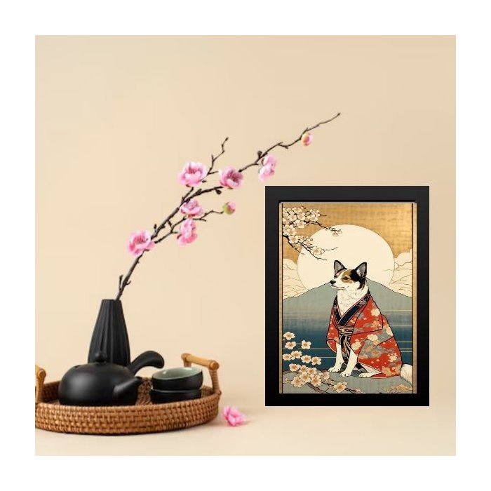 Quadro Arte Oriental Paisagem com Cachorro 24x18cm - com Vidro:moldura Preta