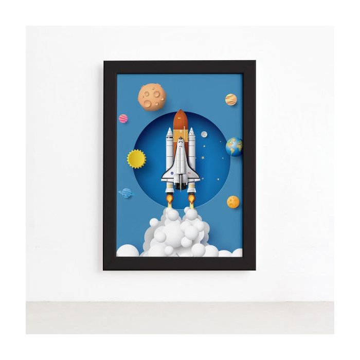 Quadro Astronauta Foguete em Órbita Moldura Preta 33x43cm Preta