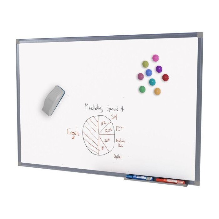 Quadro branco magnético com moldura em alumínio da linha A com cantoneiras plásticas arredondadas, tampo em laminado melamínico liso branco brilhante (fórmica) com chapa de fibra de madeira de 6mm (MDF), espessura total de 12 mm*.Para uso de marcad r de quadro branco. Recomendado uso de apagadores Stalo ou flanela macia e marcadores de quadro de boa qualidade.Acompanha kit para instalação e porta apagador.*OBS: no modelo de 300 x 120 cm possui cardboard e chapa de fibra 3mm. Espessura tota l de 12 mm.* imagens meramente ilustrativas * os produtos podem apresentar pequenas variações de cor e textura