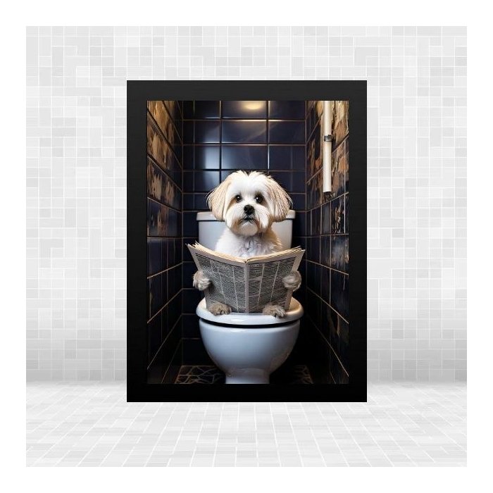 Quadro Banheiro Maltês no Vaso Lendo Jornal 33x24cm:moldura Preta