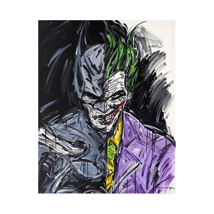 Obra de arte: Nesta obra extraordinária a dualidade inerente ao universo de Gotham City é personificada de forma deslumbrante. Metade do retrato apresenta o rosto austero do Cavaleiro das Trevas, Batman, com sua mandíbula firme e olhos penetrantes que espelham sua determinação incansável em proteger a cidade das sombras. A outra metade é dominada pela visão perturbadora do Coringa, com seu sorriso sinistro e olhos dançando com uma malícia insana. Ambos os lados se fundem harmoniosamente no centro, onde se encontram em um confronto visual intenso, simbolizando a eterna batalha entre a justiça e o caos que permeia as ruas de Gotham. O contraste entre a escuridão que envolve o lado do Batman e as cores vibrantes caóticas do lado do Coringa. Refletem a constante luta entre a luz e as trevas que definem suas personas. Neste retrato magistral, o artista captura não apenas a rivalidade épica entre esses dois ícones, mas também a intrincada teia de dualidades que os une em uma dança eterna de sombras e luz.