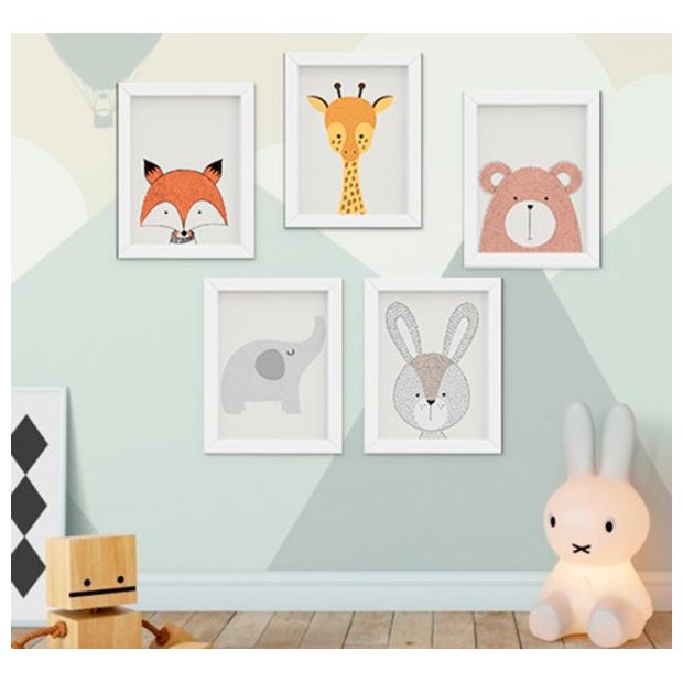 Quadro Bebê Infantil Escandinavo Raposa Girafa Coelho Urso Elefante Kit 5 Peças