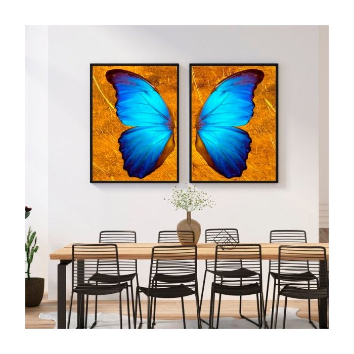 Quadro Borboleta Azul e Dourado Impacto - Kit 2 telas - 150 x 100 cm - Preta