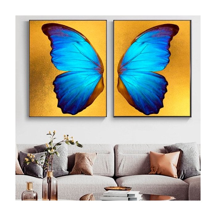 Quadro Borboleta Dourado e Azul Delicado - Kit 2 telas - 60 x 40 cm - Chassi