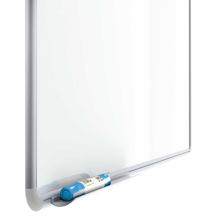 Quadro branco com fixação invisível, moldura em alumínio natural, tampo em chapa de fibra de madeira e cor branca brilhante 100% UV para uso de marcador de quadro branco. Recomendado uso de apagadores ou flanela macia e marcadores de quadro de boa qualidade.
