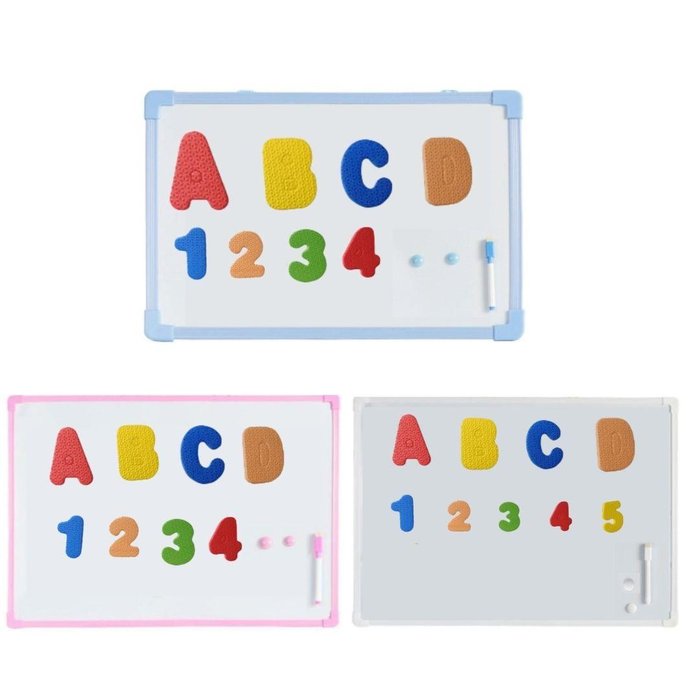 Embalagem com 1 Quadro magnético 50x35 cm 1 caneta com borracha, 2 imãs e um kit alfanumérico magnético completo