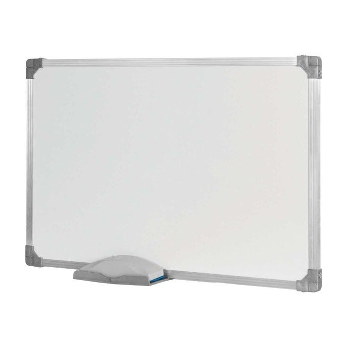 Quadro Branco Standard com Moldura em Alumínio natural e cantos plásticos, tampo em chapa de fibra de madeira e cor branca brilhante 100% UV para uso de marcador de quadro branco. Recomendado uso de apagadores ou flanela macia e marcadores de quadro de boa qualidade.
