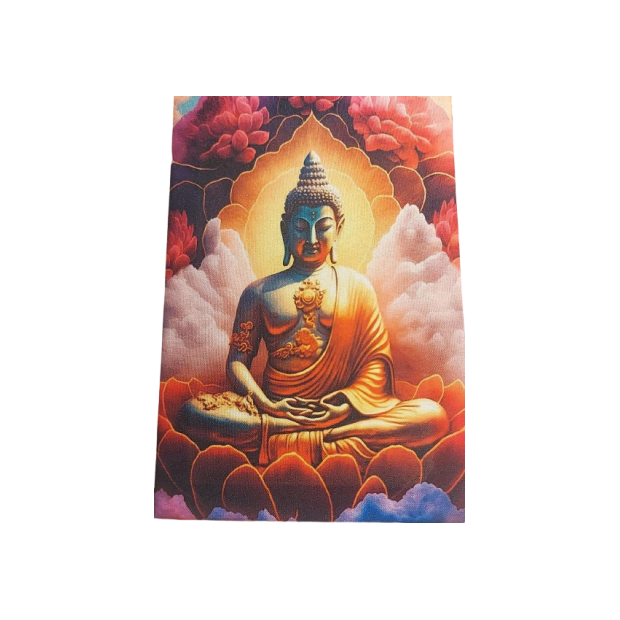 Esta em especial, retrata Buda Sidarta meditando sob flor de lotus, nas cores vermelho, amarelo e rosado. Transmitindo paz, leveza, calma e sabedoria.