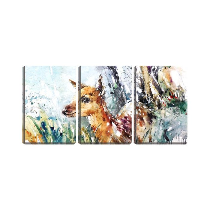 Quadro canvas 30x66 desenho cervo na mata aquarela