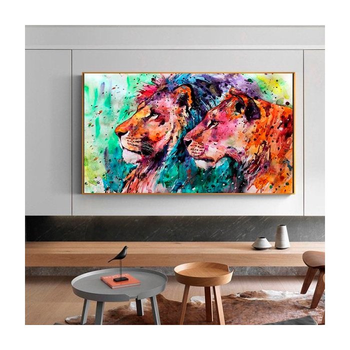 Quadro Casal Leão e Leoa Aquarela - Tela Única - 90 x 60 cm - Branca
