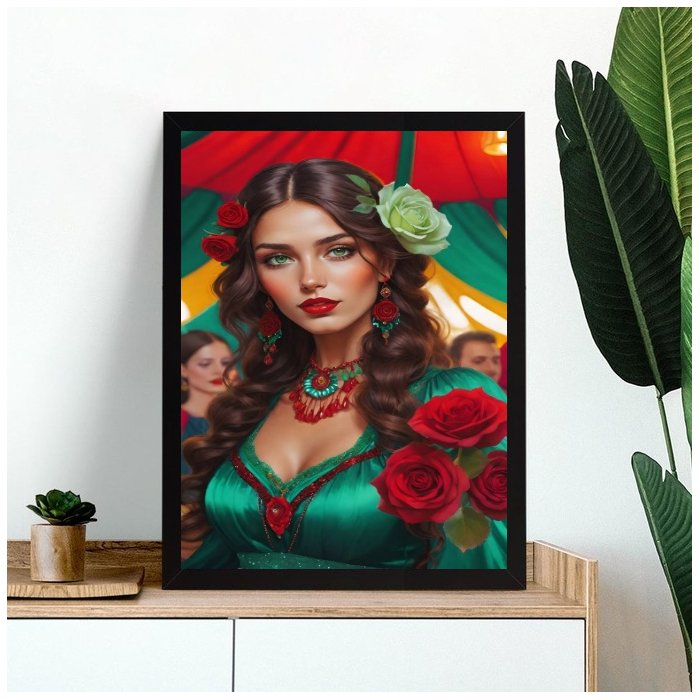 Quadro Cigana Esmeralda Rosa Vermelha 24x18cm:moldura Branca
