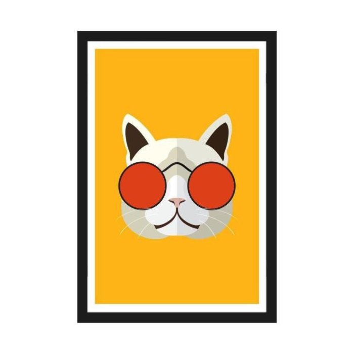 Quadro com Gato de Óculos Vermelho em Fundo Amarelo com Moldura Preta 40x60cm