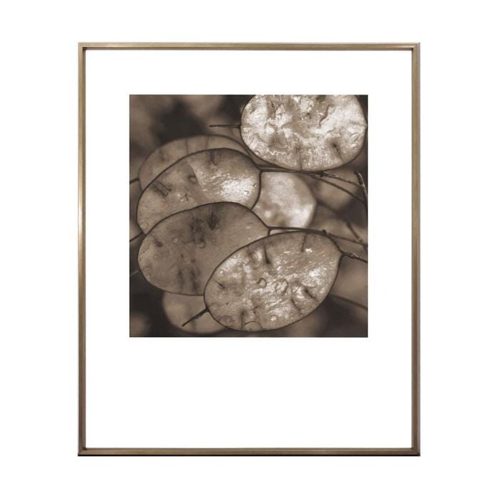 Quadro floral com moldura na cor bronze, folhas em tom sépia.