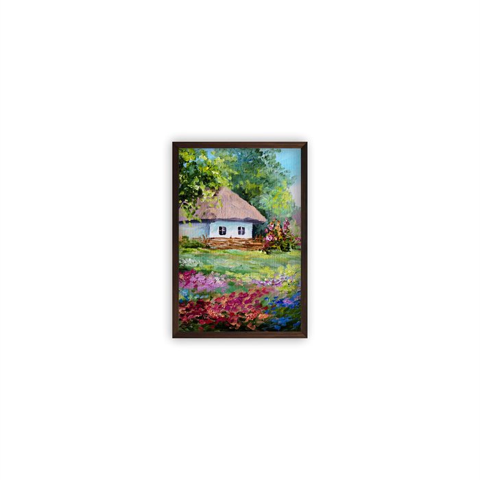 Quadro com moldura marrom e vidro Pintura de casa no campo