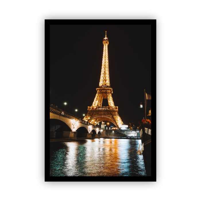 Quadro com moldura preta e vidro da Torre Eiffel Noite Iluminada Luzes