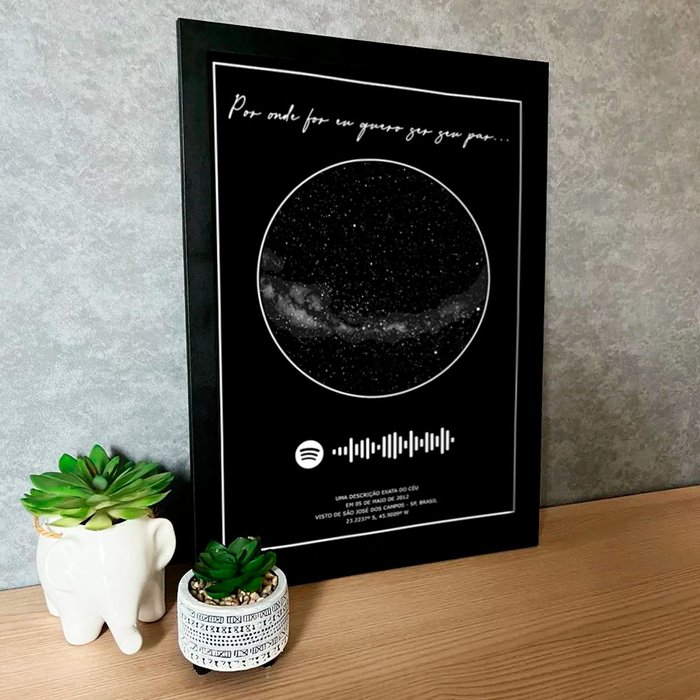 O Quadro Mapa das Estrelas Spotify com Música vai mostrar exatamente o alinhamento das estrelas no lugar e hora escolhidos por você.. Pode ser qualquer data e qualquer lugar como o dia e hora do seu nascimento, o dia do seu casamento ou algum acontecimento especial, registraremos a localização exata das estrelas nesse momento em particular em um lindo quadro com moldura e Link de música que será tocada ao apontando o celular para ela.