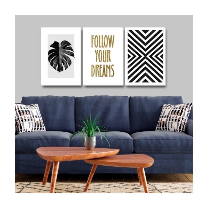 Kit composto por 3 quadros que formam no total uma imagem de 129 cm x 60 cm (deixando 3 cm de distância entre as peças).Cada peça mede 41 x 60 cm.Molduras disponíveis nas cores preta, branca e tabaco.São vários temas prontos e personalizáveis para todos os tipos de ambientes.Super simples de pendurar na parede. Basta um martelo e 3 preguinhos pequenos.Não necessita de vidro. As imagens são impressas em adesivo fosco ou brilho (de acordo com cada tema) em plotters de impressão digital - imagens em alta resolução e durabilidade.Restou alguma dúvida? Contate-nos!