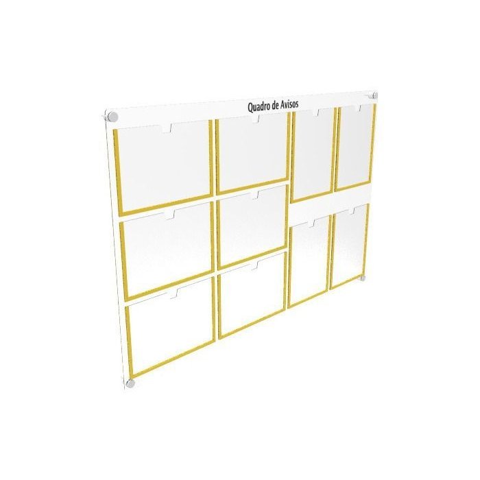 Quadro de avisos é uma excelente escolha para informar e expor avisos de forma prática. Fabricado em Acrílico Cristal e com porta folhas também em acrílico, o quadro de avisos permite que sejam trocados os informativos sem a necessidade de fitas, imãs ou percevejos, pois basta encaixá-los nos porta-folhas, mantendo a beleza da peça e deixando o ambiente de trabalho ainda mais profissional.